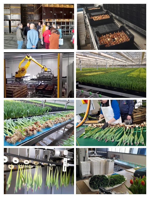 Wanneer er tulpen met de boot naar Amerika gaan (in containers), wordt er in het water een extraatje gedaan, waardoor de tulpen fris blijven en evengoed een week op de vaas goed blijven. Het drogen van de bollen is zeer belangrijk. Hoe droger de bol, hoe minder last van virussen. “Het moet stoffen, dan is ’t droog”. Er worden 10.000 bollen per uur door een machine opgeprikt. Deze prikbakken zijn van tevoren heel goed gereinigd. Er zijn 90.000 prikbakken! Dit is ook weer een gesloten circuit. Een machine meet via röntgen de rijpheid van de bol. Via AI worden de zure bollen uit de stroom bollen geselecteerd en verwijderd. Het is ongelooflijk wat voor technische ontwikkelingen er momenteel zijn.